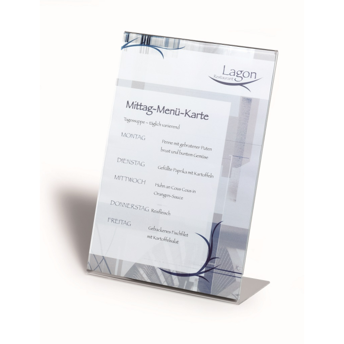 Stojan vhodný na prezentáciu ľubovoľných informácií. Vyrobený z kvalitného číreho akrylu. Samolepiace gumové podložky zabezpečujú dobrú stabilitu. Formát A4.