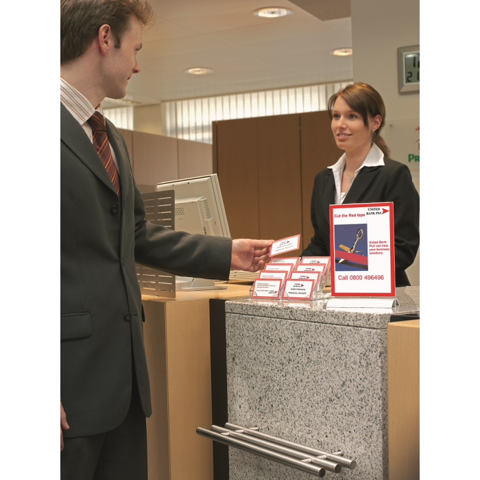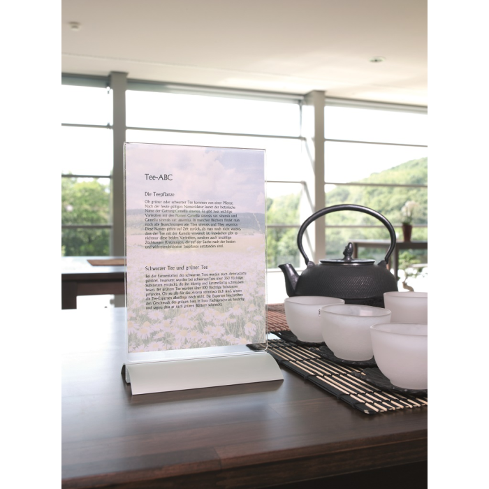 Stojan vhodný na prezentáciu ľubovoľných informácií s dobrou stabilitou. Vrchná časť vyrobená z kvalitného číreho akrylu, elegantný podstavec z hlíníka.