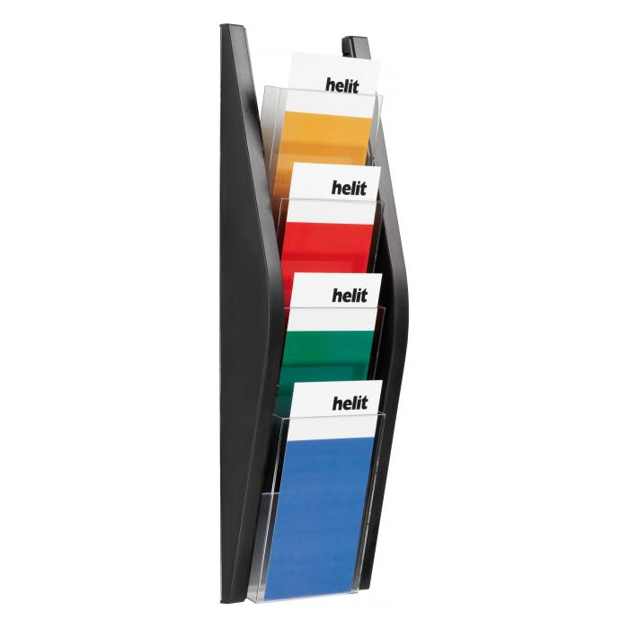Nástenný stojan na prezentáciu materiálov. Štyri priehľadné priehradky slúžia na umiestnenie materiálov formátu 1/3 A4. Materiál kvalitný plast. Rozmery (š x v x h) 165 x 540 x 80 mm. Farba čierna.