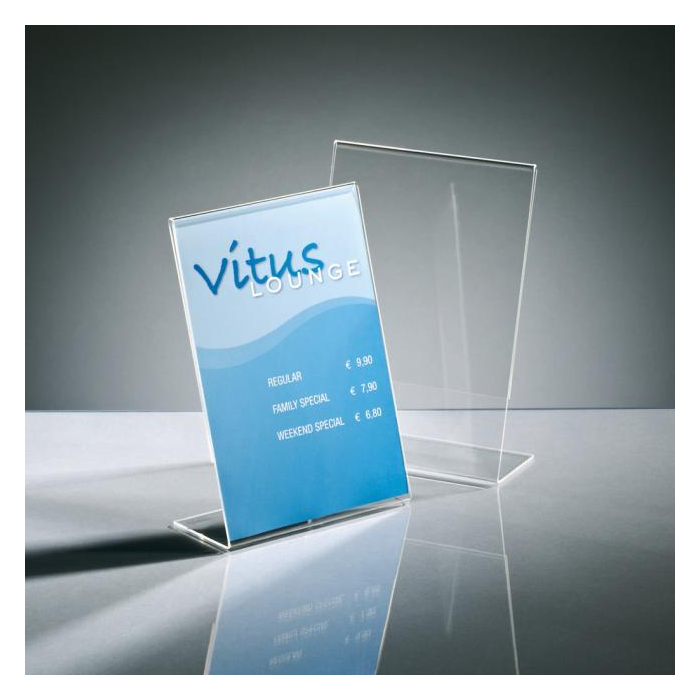 Univerzálny stojan odolný voči UV žiareniu v naklonenej verzii. Vhodný na výstavy, veľtrhy, ponukové listy, jedálne lístky a propagačné materiály. Vyrobený z kvalitného číreho akrylu, stabilný a pevný. Formát A5.