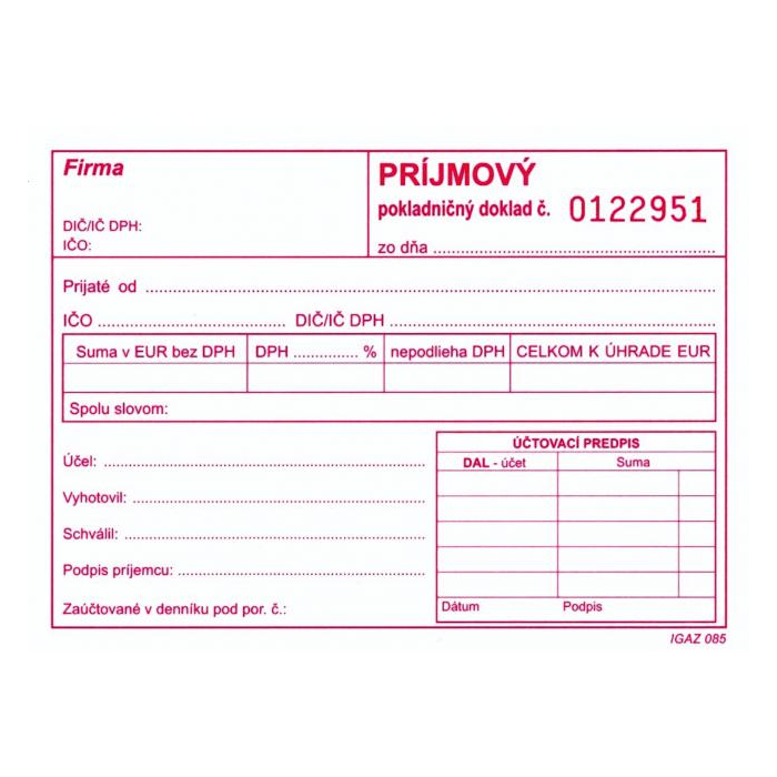 Príjmový pokladničný doklad s DPH, samoprepis. Blok formátu A6, 100 listov, číslovaný.