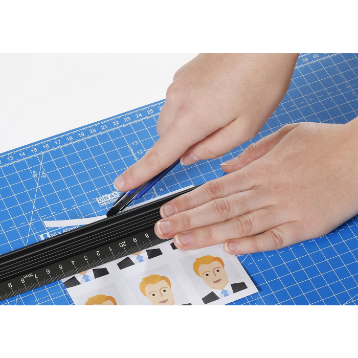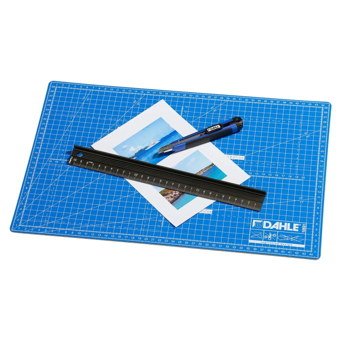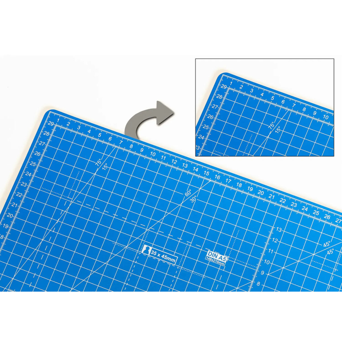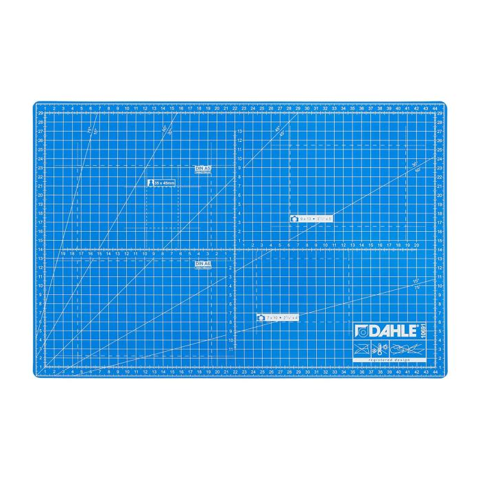 Obojstranná rezacia podložka s robustnou 5-vrstvovou konštrukciou s jadrom odolným proti prerezaniu, s predtlačenou mriežkou na jednej strane a protišmykovou zadnou stranou poskytuje čisté a precízne rezanie a chráni pracovný povrch pred dorezaním. Prehľadne usporiadané vodiace čiary pre optimálne umiestnenie rezaného materiálu Vyrobená z PVC v hrúbke 3 mm. Farba modrá s bielou predtlačenou mriežkou. Rozmer 45 x 30 cm.