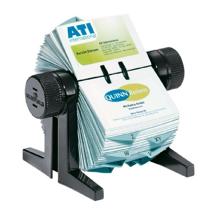 Praktický rotačný vizitkár s rozraďovačom. Vyrobený z kvalitného plastu. Obsahuje 150 obojstranných vreciek rozmeru 72 × 104 mm a abecedný rozraďovač s 25 oddielmi. Kapacita 300 vizitiek. Vrecká na vizitky sa ľahko vyberajú a umožňujú tak rýchle narábanie s vizitkami.