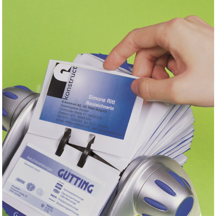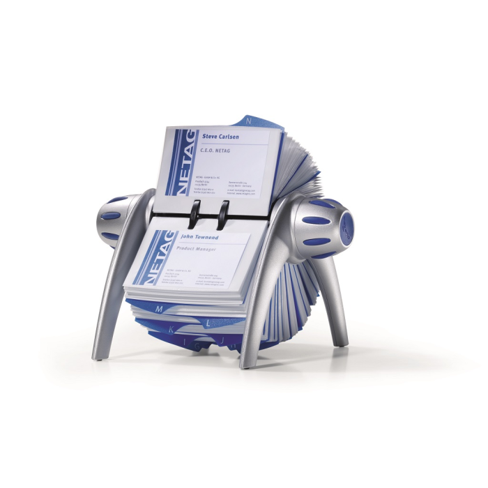 Rotačný vizitkár v exkluzívnom dizajne z plastu v kvalitnej povrchovej úprave. 200 obojstranných vreciek rozmeru 72 × 104 mm pre 400 vizitiek, abecedný rozraďovač s 25 oddielmi. Doplniteľný náhradnými vreckami Obj. kód DU241819.