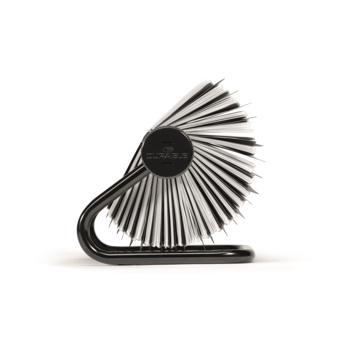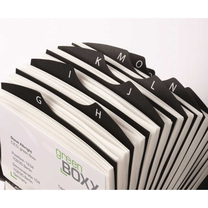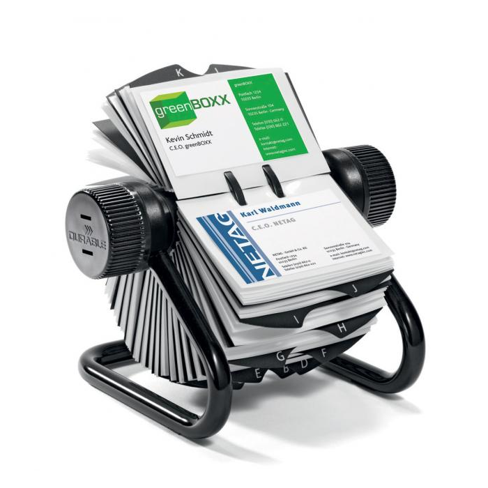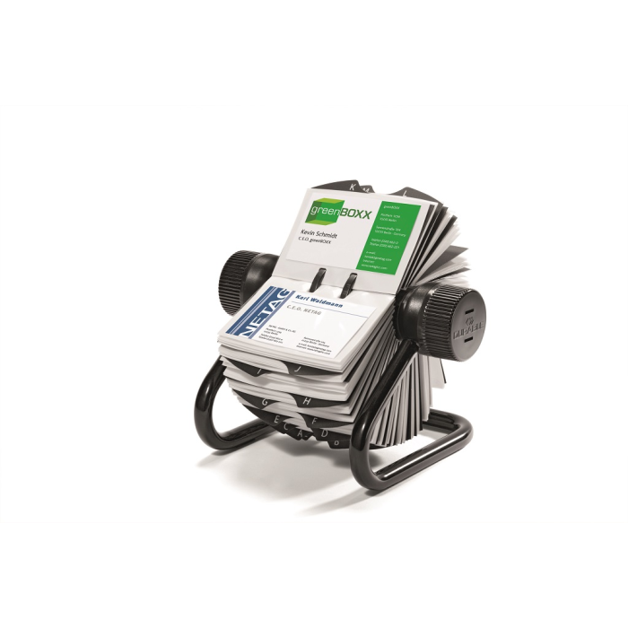 Rotačný vizitkár s 200 obojstrannými vreckami rozmerov 104 × 72 mm na 400 vizitiek. Dodávaný s 25 abecednými rozraďovačmi A - Z. Ľahký prístup k vizitkám, rýchla obsluha vďaka špeciálnemu rotačnému mechanizmu. Farba čierna.