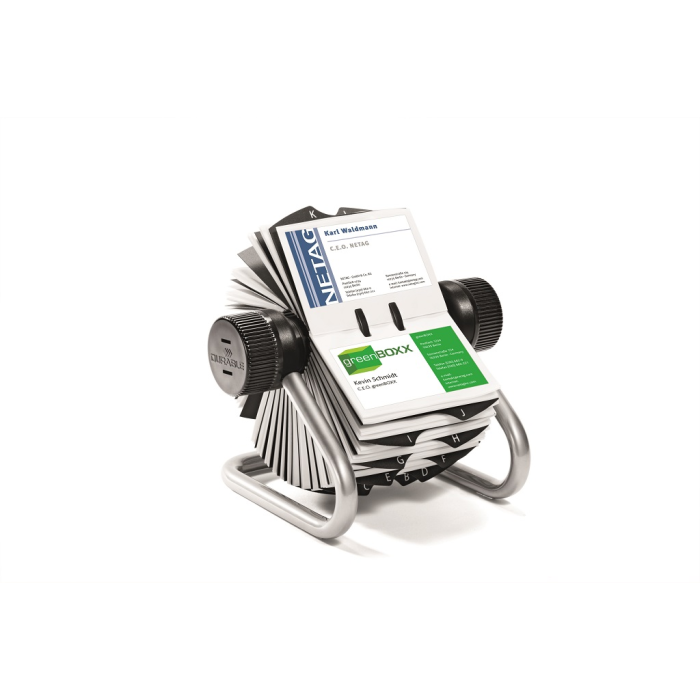 Rotačný vizitkár s 200 obojstrannými vreckami rozmerov 104 × 72 mm na 400 vizitiek. Dodávaný s 25 abecednými rozraďovačmi A - Z. Ľahký prístup k vizitkám, rýchla obsluha vďaka špeciálnemu rotačnému mechanizmu. Farba strieborná.