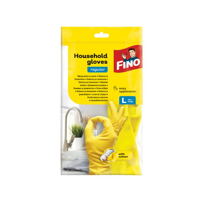 Fino špeciálne rukavice pre domácnosť chránia vaše ruky proti porezaniu, horúcej a studenej vode a čistiacim prostriedkom. Vďaka bavlnenej výstelke predchádzajú poteniu rúk a pevný stisk zaisťuje tiež špeciálny plastický povrch. Po každom použití dôkladne propláchnite a nechajte uschnúť. Rukavice by nemali byť vystavené priamemu slnečnému žiareniu alebo inému silnému tepelnému zdroju.