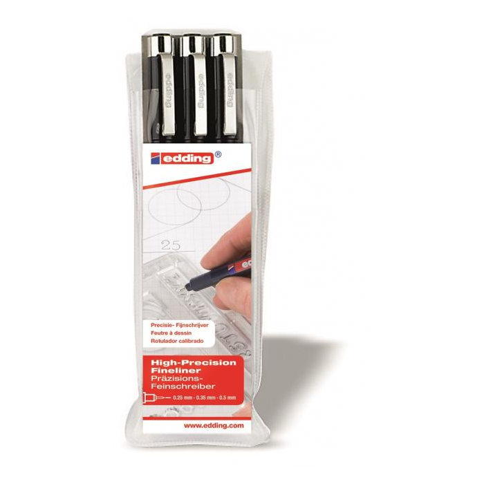 Špeciálny jednorazový popisovač s vláknitým hrotom, kovovým klipom a uzáverom je určený na kreslenie, náčrty, technické kreslenie a pod. Plnený vo vode rozpustným atramentom, ktorý na svetle nebledne. Farba čierna. Balenie sada 3 ks po jednom v hrúbkach 0,1 / 0,3 / 0,5 mm.