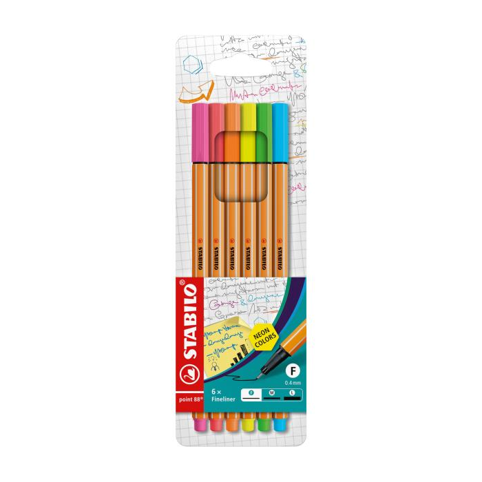 Veľmi obľúbený jednorazový liner na atramentovej báze. Vhodný na písanie a rysovanie podľa šablóny alebo pravítka. Kovové puzdro hrotu zaisťuje dlhú životnosť. Šírka stopy 0,4 mm. Sada 6 neónových farieb.