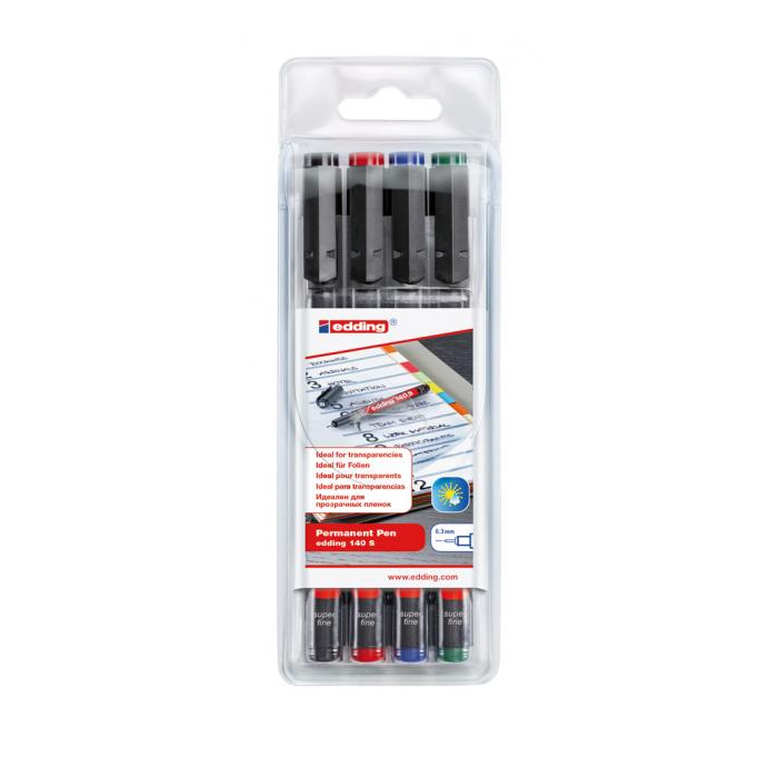 Permanentný popisovač s vysoko nepriehľadným atramentom, vhodný na popisovanie priesvitných fólií na spätnú projekciu, sklo a umelú hmotu. Vodeodolný, zmazateľný iba liehom. Hrot okrúhly, šírka stopy 0,3 mm. Sada 4 ks v mixe farieb.