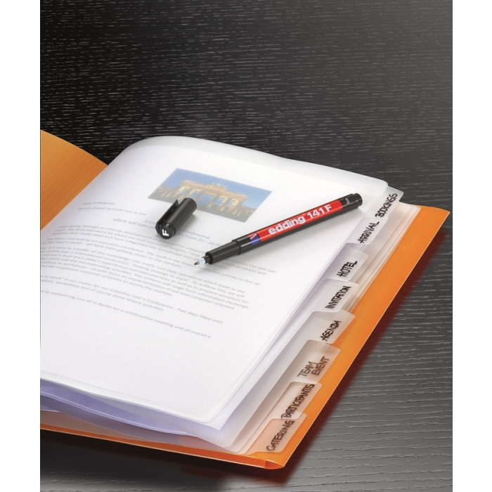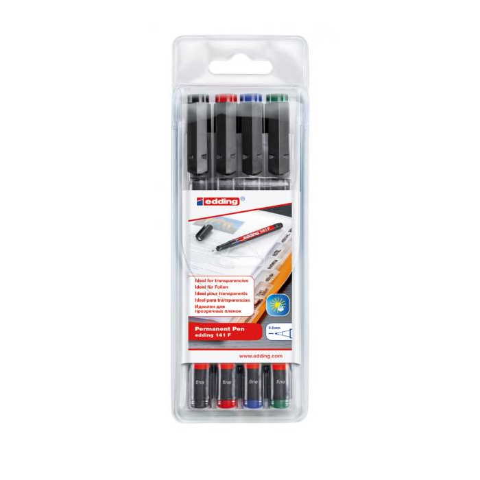 Permanentný popisovač s vysoko nepriehľadným atramentom, vhodný na popisovanie priesvitných fólií na spätnú projekciu, sklo a umelú hmotu. Vodeodolný, zmazateľný iba liehom. Hrot okrúhly, šírka stopy 0,6 mm. Sada 4 ks.