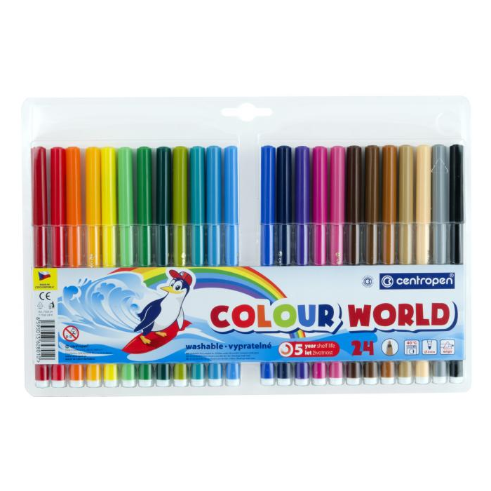 Farebné popisovače, ERGO držanie, zdraviu neškodlivý atrament, odolávajú vyschnutiu až 5 rokov, vyprateľné, ventilačný vrchnák, vláknový hrot odolný voči zatlačeniu šírka stopy 1 mm.