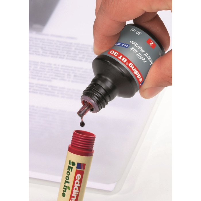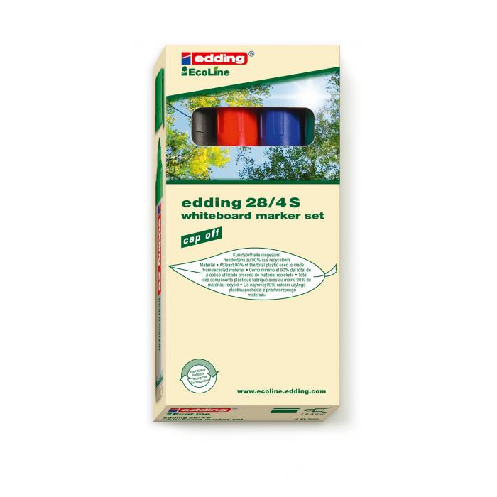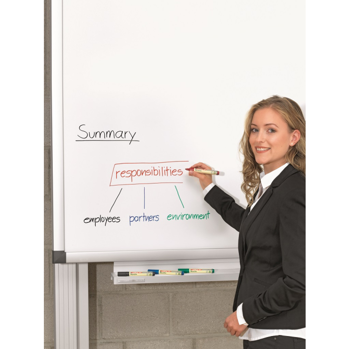 Popisovač na biele tabule, za sucha stierateľný prakticky zo všetkých neporóznych povrchov, ako je keramická úprava, melamín i sklo. Minimálne 80 % plastovej časti je vyrobených z recyklovaného materiálu. Okrúhly hrot, šírka stopy 1,5 - 3 mm. Rýchloschnúci, vodeodolný, slabo zapáchajúci atrament intenzívnej farby. Krátky čas vydrží neuzavretý bez vyschnutia. Dodávaný v sade 4 ks.