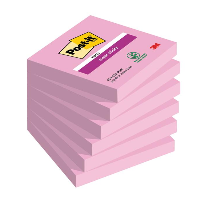 Bločky Post‑it® Super Sticky™ so špeciálnym lepidlom, vďaka ktorému držia aj na nerovnom povrchu. Po odlepení nezanechávajú stopy po lepidle. Farba ružová. Rozmery 76 x76 mm. Počet lístkov 6 x 90.