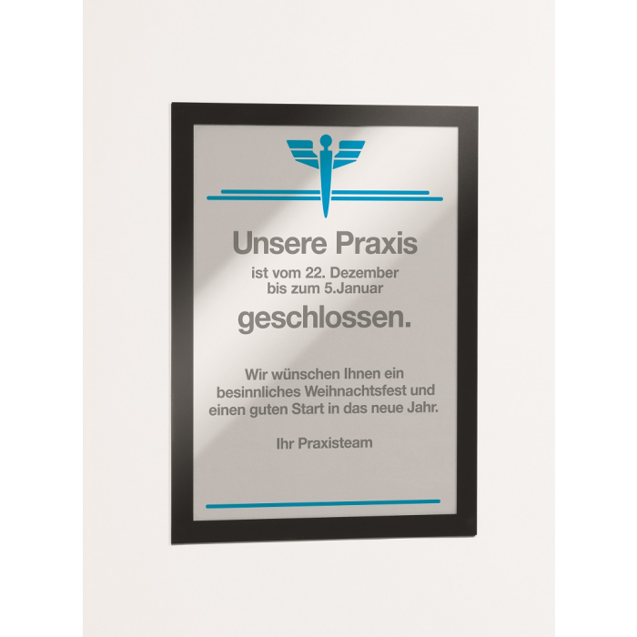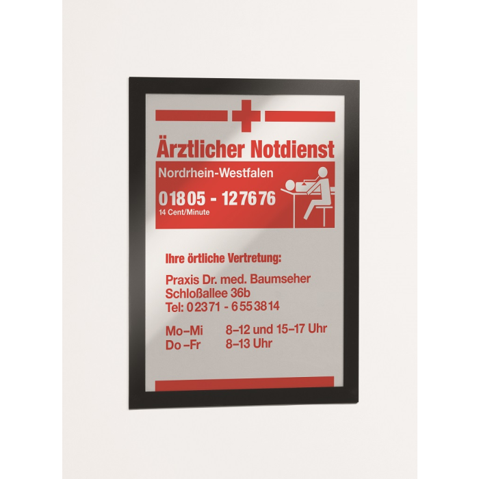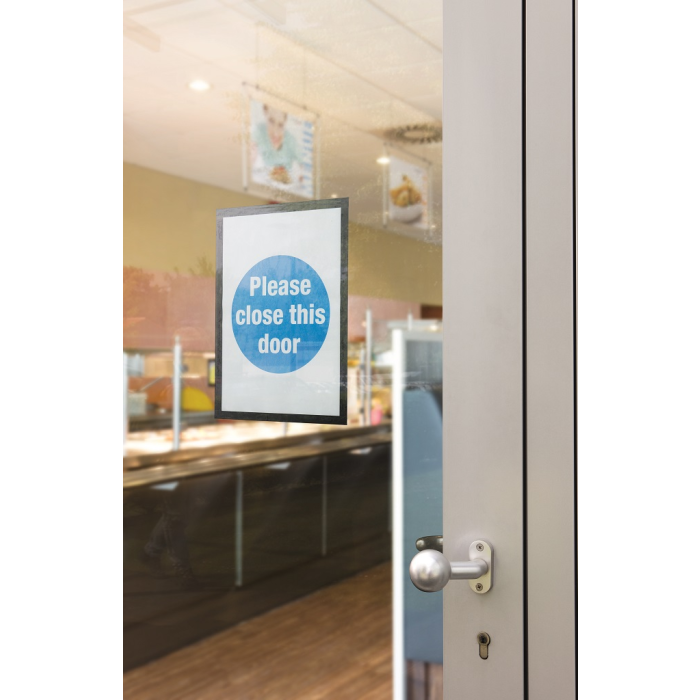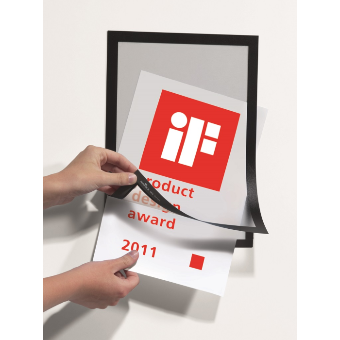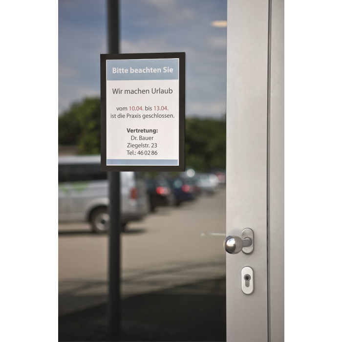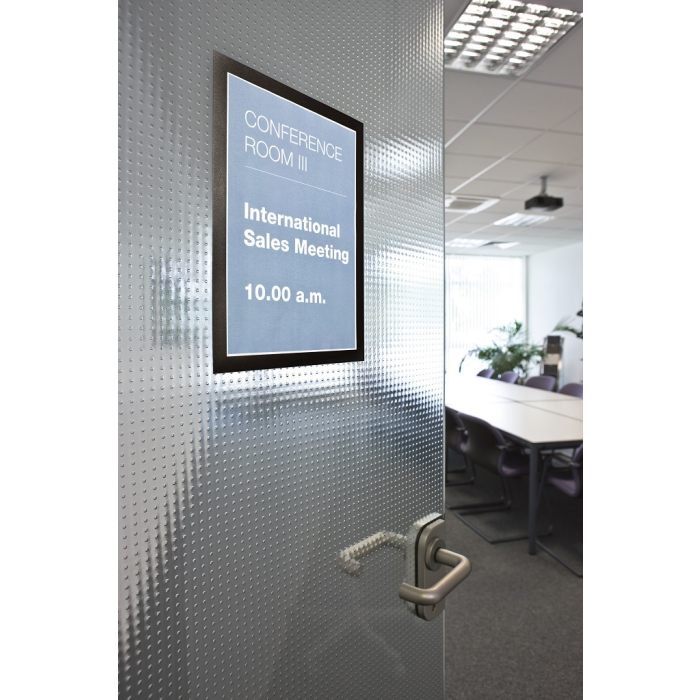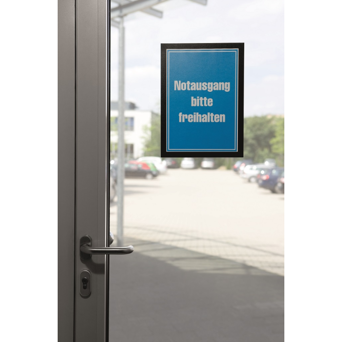 Samolepiaci informačný panel s prednou magnetickou časťou. Ideálny na vystavovanie plagátov, kľúčových informácií, špeciálnych oznamov alebo dôležitých čísel. Informácie sa ľahko vymieňajú a sú čitateľné z oboch strán, ak sa panel umiestni napr. na okno alebo priehľadné dvere. Vhodný na hladké a pevné povrchy. V prípade potreby je ľahko premiestniteľný bez potreby vŕtania. Formát A4, rámik čierny.