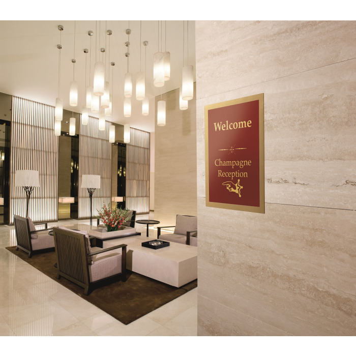 Samolepiaci informačný panel s prednou magnetickou časťou. Ideálny na vystavovanie kľúčových informácií, špeciálnych oznamov alebo dôležitých čísel. Informácie sa ľahko vymieňajú a sú čitateľné z oboch strán, ak sa panel umiestni napr. na okno alebo priehľadné dvere. Vhodný na hladké a pevné povrchy. V prípade potreby je ľahko premiestniteľný bez potreby vŕtania. Formát A4, farba rámu zlatá. V balení 2 ks.