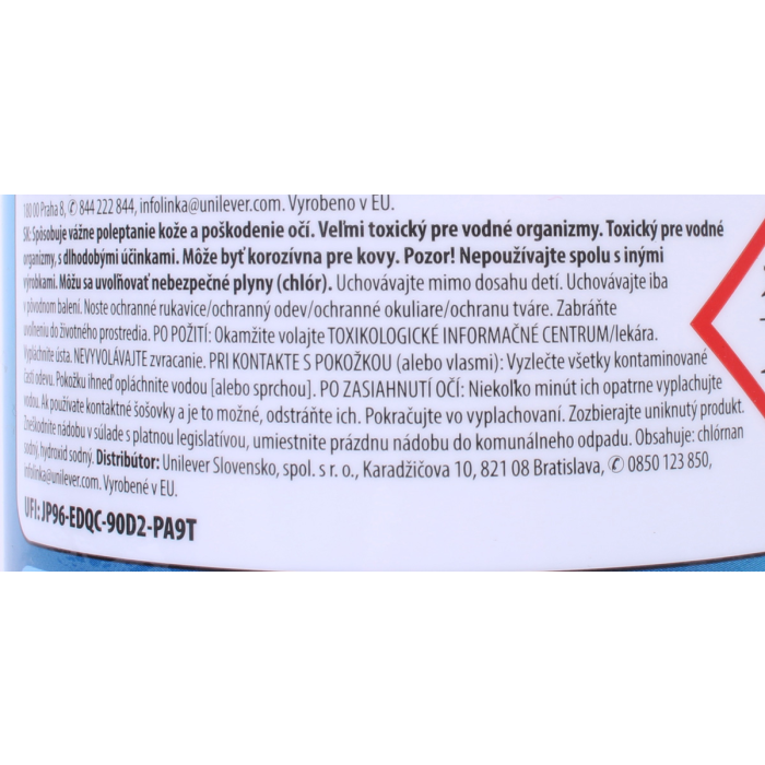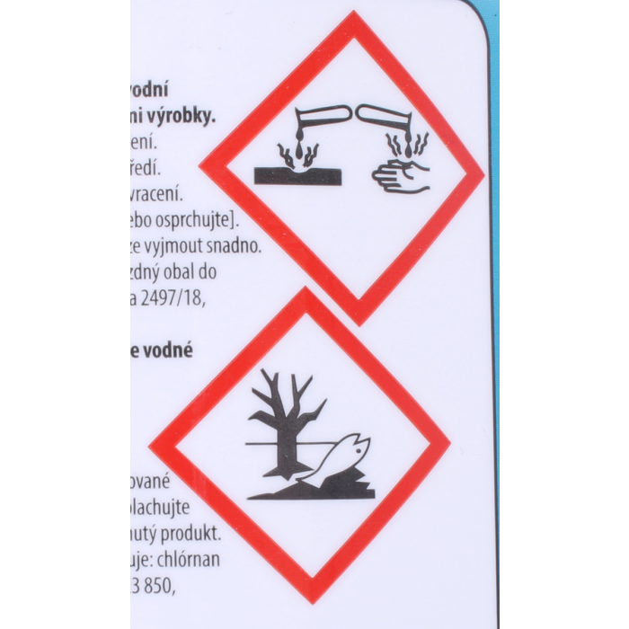 Spôsobuje vážne poleptanie kože a poškodenie očí. Veľmi toxický pre vodné organizmy. Toxický pre vodné organizmy, s dlhodobými účinkami. Môže byť korozívna pre kovy. Pozor! Nepoužívajte spolu s inými výrobkami. Môžu sa uvoľňovať nebezpečné plyny (chlór). Uchovávajte mimo dosahu detí. Uchovávajte iba v pôvodnom balení. Noste ochranné rukavice/ ochranný odev/ ochranné okuliare/ ochranu tváre. Zabráňte uvoľneniu do životného prostredia.