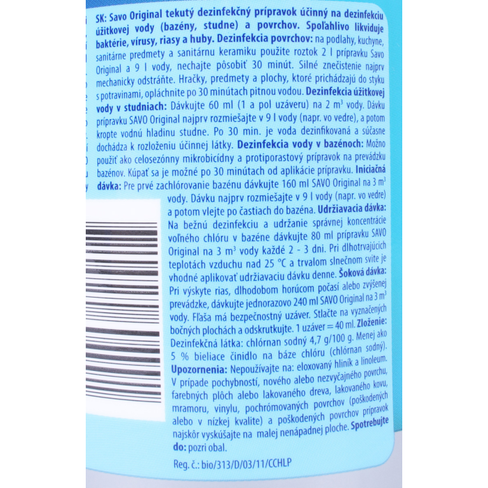 Tekutý dezinfekčný prípravok na dezinfekciu vody a povrchov. Spoľahlivo likviduje baktérie, vírusy, riasy a huby. SAVO Original likviduje choroboplodné zárodky, baktérie a vírusy (vrátane HIV a HBV), riasy a nižšie huby, odstraňuje pachy. Vyniká mimoriadne vysokou čistotou, dlhou záručou lehotou a unikátnou ekologickou hodnotou, pre ktorú je schválený aj pre dezinfekciu vody v bazénoch a ako jediný aj pre pitnú vodu v studniach. Dezinfekcia povrchov:na podlahy, kuchyne, sanitárne predmety a sanitárnu keramiku použite roztok 2 l prípravku Savo original a 9 l vody, nechajte pôsobiť 30 minút. Silné znečistenie najprv mechanicky odstráňte. Hračky, predmety a plochy, ktoré prichádzajú do styku s potravinami, opláchnite po 30 minútach pitnou vodou.