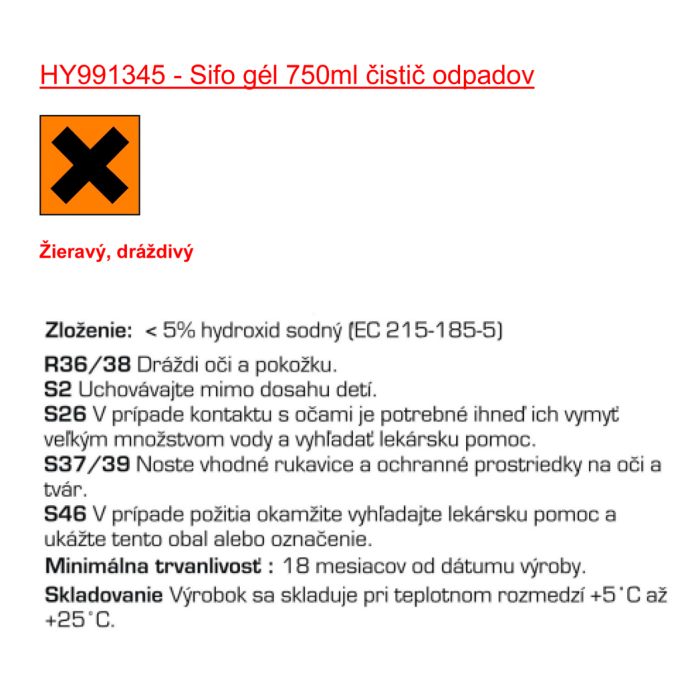 Návod na použitie: Do upchaného sifónu (odpadu) nalejte 1/3 objemu fľaše. Nechajte pôsobiť 45 minút (pri silnejšom znečistení dlhšie). Dôkladne prepláchnite horúcou vodou.