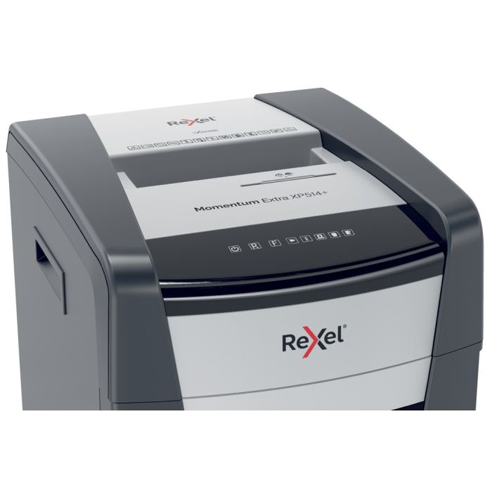 Skartovačky Rexel Momentum Extra s technológiou proti zasekávaniu papiera sú ideálne na likvidáciu dôverných dokumentov v kancelárii. Skartovačka XP514+ skartuje až 14 hárkov papiera A4 (80 g/m2) naraz cez otvor na ručné podávanie mikrorezom s veľkosťou P-5 (2 × 15 mm). Technológia aktívneho snímania meria počet podávaných hárkov v reálnom čase, aby sa zabránilo zaseknutiu a nesprávnemu podávaniu papiera; signalizuje to červená LED dióda na ovládacom paneli. Skartovačka nebude pracovať, kým počet hárkov neklesne pod maximálnu kapacitu alebo ju nedosiahne. Táto skartovačka s krížovým rezom je určená na stredne náročné až náročné použitie vďaka vysokej kapacite hárkov, veľkému 60-litrovému košu a nepretržitej prevádzke.