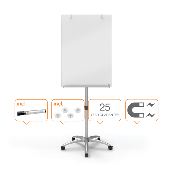 Na sklenený flipchart Nobo sa vojdú všetky vaše nápady! Štýlový moderný dizajn a výškovo nastaviteľná základňa na kolieskach sa hodí do každej zasadacej miestnosti a kancelárie. Obsahuje háčiky na zavesenie flipchart blokov. Magnetický sklenený povrch zaručuje najlepšiu možnú mazateľnosť a je vhodný na každodenné používanie. Rozmery 70 x 100 cm.