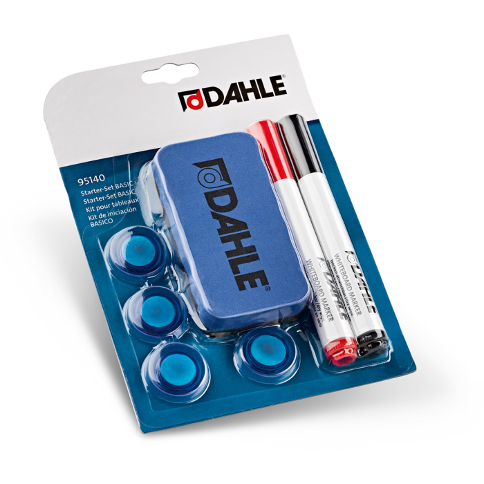 Základná výbava k bielym tabuliam obsahuje 2 popisovače v čiernej a červenej farbe, jednorazovú modrú stierku 95097 a 4 magnety ø 30 mm, s prítlačnou silou cca 3 Newtony, v modrej farbe.