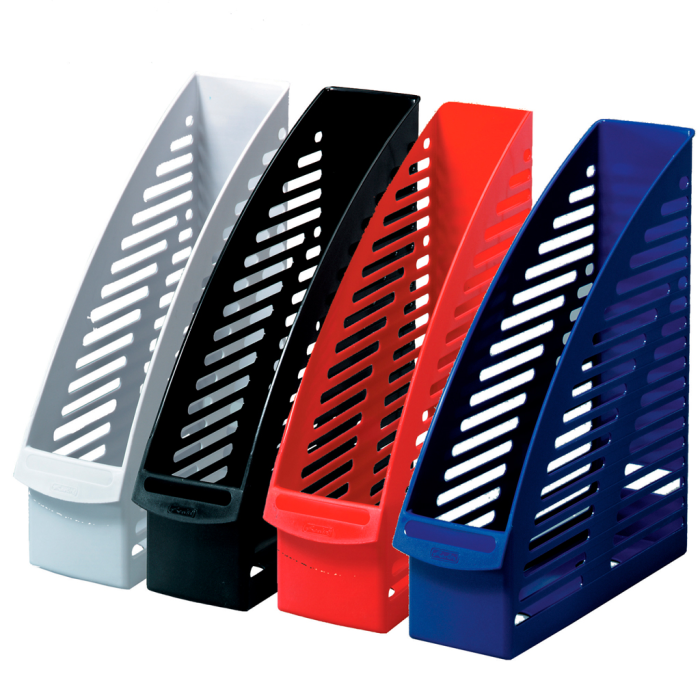 Plastový stojan na časopisy zaoblený dizajn - odolný materiál, miesto na etiketu na chrbte. Farba červená.