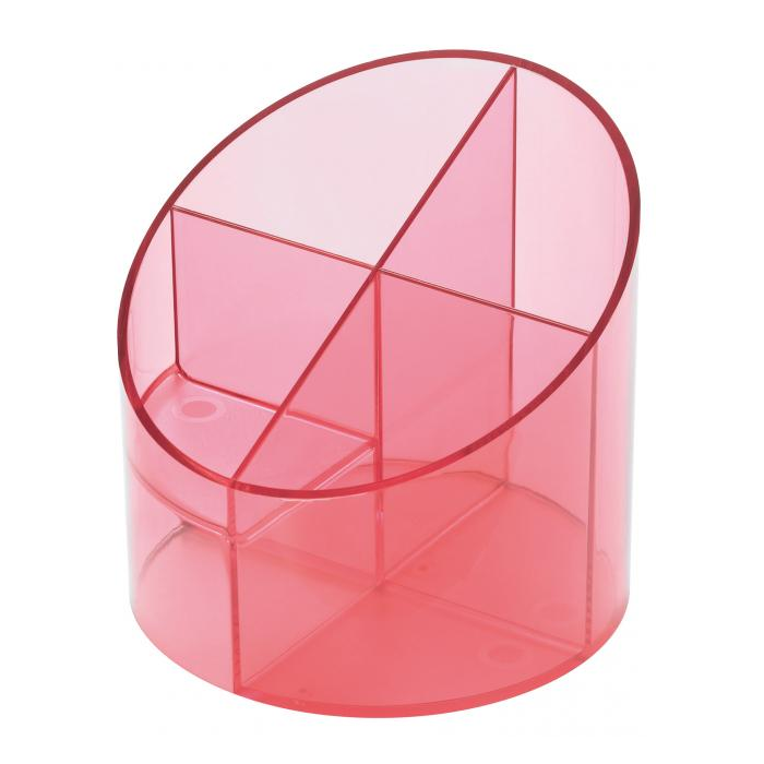 Stojan so štyrmi oddielmi na perá, ceruzky a kancelárske drobnosti z plastu v ekonomickom prevedení. Výška 105 mm, priemer 110 mm. Farba priehľadná červená.