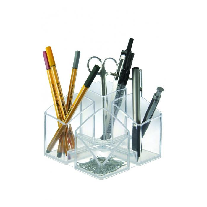 Stojan so 4 sekciami na písacie potreby a ďalšie kancelárske drobnosti. Spodná strana s protišmykovou úpravou. Materiál kvalitný plast vysokého lesku. Pri spojení 2 alebo 4 stojanov dosiahnete zaujímový moderný efekt. Rozmery 125 × 125 × 100 mm. Stojan dodávaný prázdny. Farba: priehľadná číra