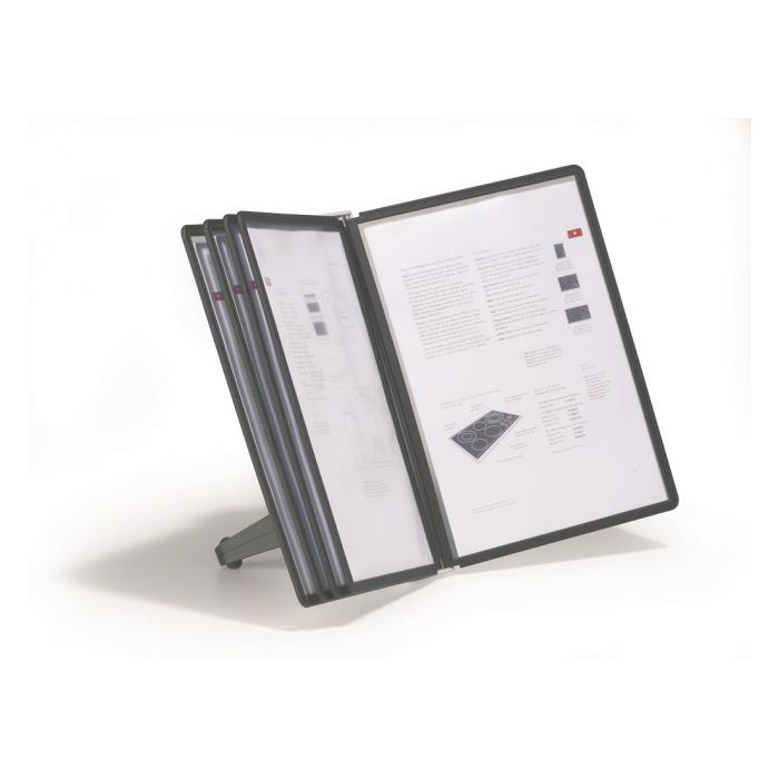 Stojan na stôl s 5 polypropylénovými displejovými panelmi formátu A4 do malých kancelárií. Stabilná základňa, systém ideálny pre užívateľov, ktorí sú obmedzení nedostatkom miesta. Farba základne i panelových rámčekov čierna. Kapacita panelov: 5 Dodávaný: s panelmi Farby panelov: čierna