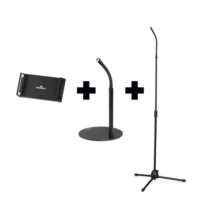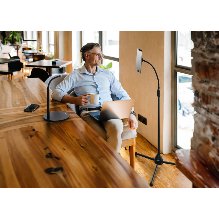 • Stojan na stôl a podlahu s držiakom na tablet a mobilný telefón, vybavený flexibilným ramenom a guľovým kĺbom