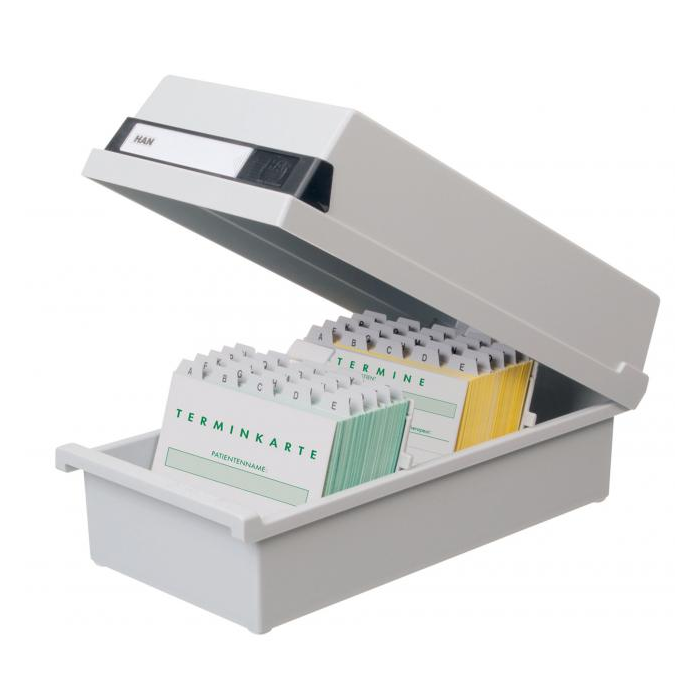 Kartotéka z antistatického nárazuvzdorného plastu na 1000 kartičiek ukladaných horizontálne. Vybavená dvoma plastovými oddeľovačmi, (inak prázdna) a ochrannými plstenými podložkami. Pri používaní možno odňať kryt a podložiť ho pod kartotéku. Formát karty: A6 Vonkajší rozmer: 177x360x140 mm Farba: sivá