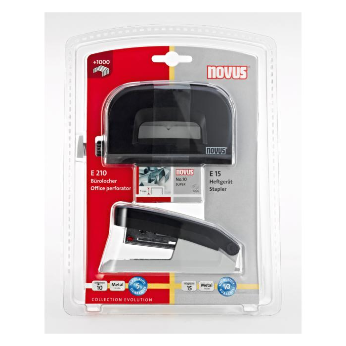 Ľahká praktická kancelárska zošívačka a dierovačka z kolekcie Evolution, dodávaná so spinkami. Zošívačka má vrchný diel z plastu a integrovanú kovovú rozošívačku na zadnej časti. Kapacita náplne 100 spiniek veľkosti No.10. Hĺbka zošívania 3,7 cm. Dierovačka má kovovú základňu, plášť v plastovo-kovovom prevedení a posuvné pravítko. Rozpätie dier 8 cm. Farba čierna/sivá.