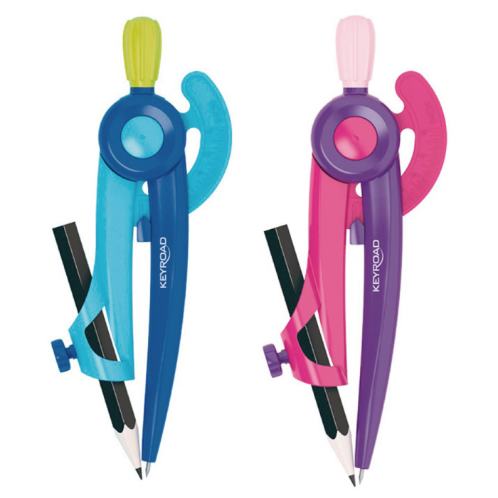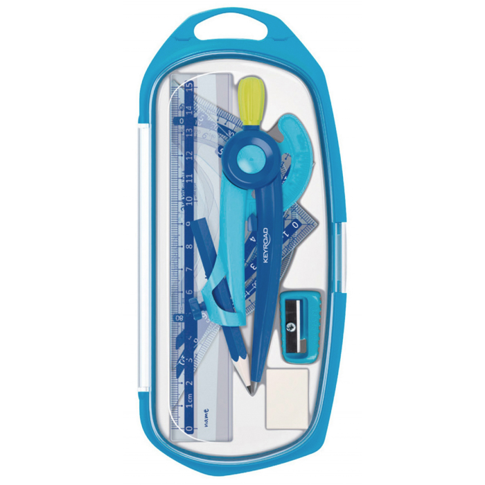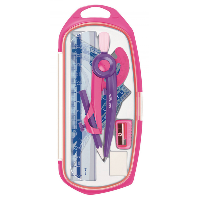 Súprava školských pomôcok na geometriu užitočná pre každého študenta. Mierka podľa noriem. Veľká sada: kružidlo, pravítko, uhlomer, trojuholník, strúhadlo, guma. Farba: mix farieb.