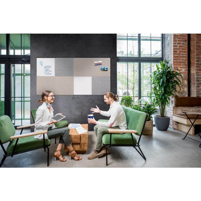 Bezrámová zvuk pohlcujúca nástenná tabuľa, ktorá zlepšuje akustiku v miestnosti. Jednoduchá montáž na stenu pomocou magnetických dosiek, hmoždiniek a skrutiek. Rozmer 75 x 50 cm. Farba sivá.