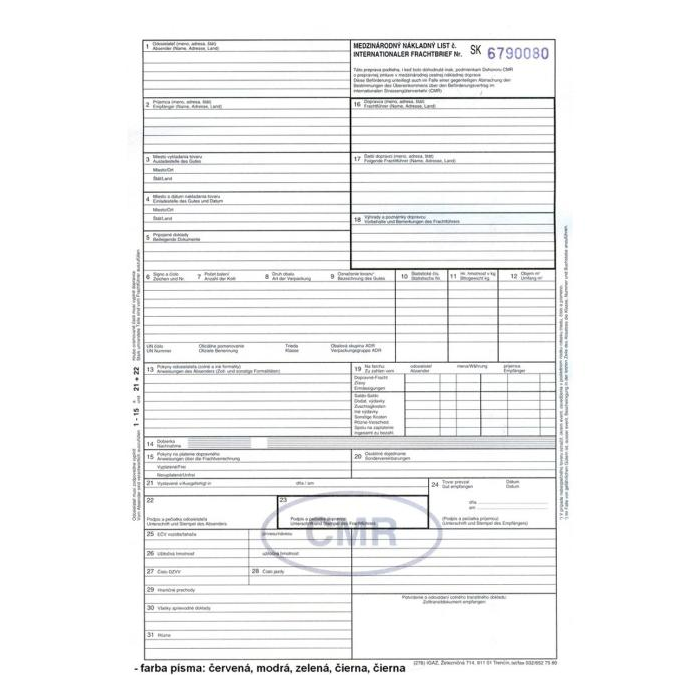 CMR medzinárodný nákladný list A4, samoprepis, 5-listový, /278/ 100 ks v bal.
