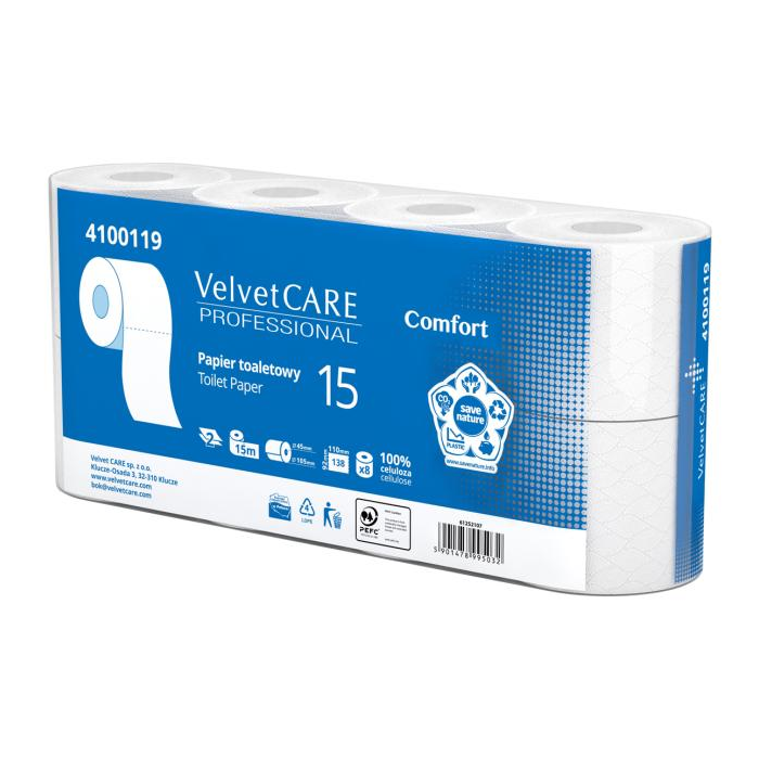 Silný a mäkký 2-vrstvový toaletný papier Velvet CARE Professional Comfort s délkou role 15 metrov, 8 roliek v balení, 138 útržkov, 100 % celulóza