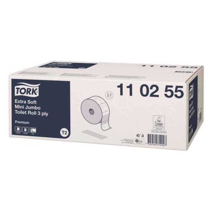 Systém Tork Mini Jumbo je časovo efektívny a znižuje náklady, pričom ponúka oveľa väčšie množstvo toaletného papiera ako štandardný kotúč. Tork Mini Jumbo extra jemný 3-vrstvový toaletný papier ponúka výnimočný vzhľad a pocit na dotyk spolu s výborným výkonom, a je vhodný do stredne až vysoko frekventovaných prostredí.
