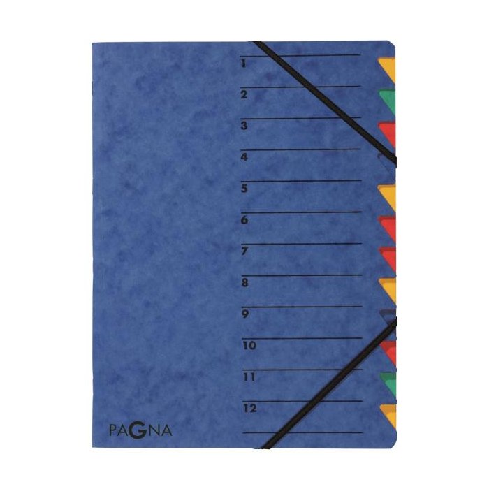 Triediaca zložka s 12 oddielmi, farebnými kartónovými listami a indexom, uzatvárateľná gumičkou. Možnosť popisu obsahu na titulnej strane.