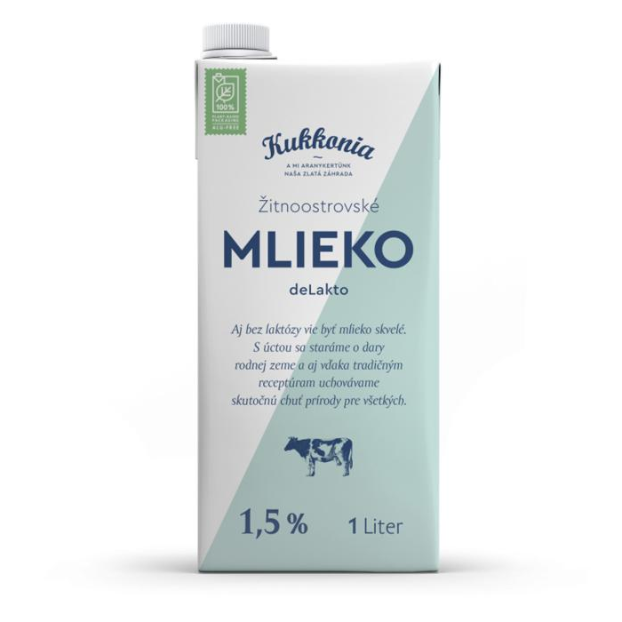 Trvanlivé mlieko konzumné, delaktózové. Ošetrené UHT ohrevom, homogenizované. Tuk najmenej 1,5% hmot.