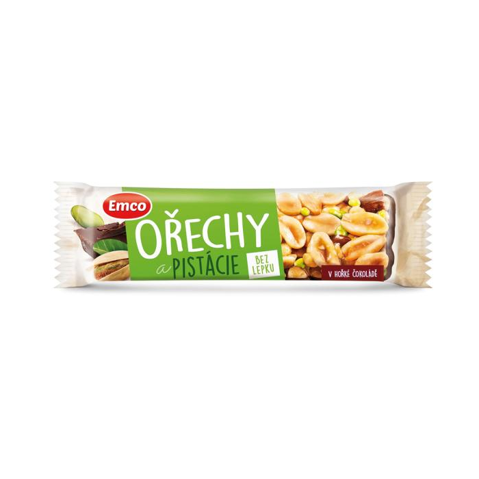 Pražené arašidy 39 %, pražené mandle 12,8 %, sirup z invertovaného cukru, horká čokoláda 12 % (cukor, kakaové maslo, kakaový prášok so zníženým obsahom tuku, kakaová hmota, emulgátor: řepkový lecitín, vanilkový extrakt; obsah kakaových súčastí 53 %), maltózový sirup, pražené pistácie 5 %, extrudované cereálie (kukuričná múka, ryža, cukor, jedlá soľ), dextróza, med kvetový 2,4 %, rýžová múka, emulgátor: repkový lecitín, jedlá soľ.