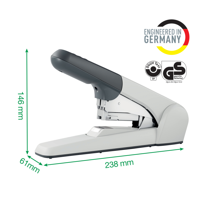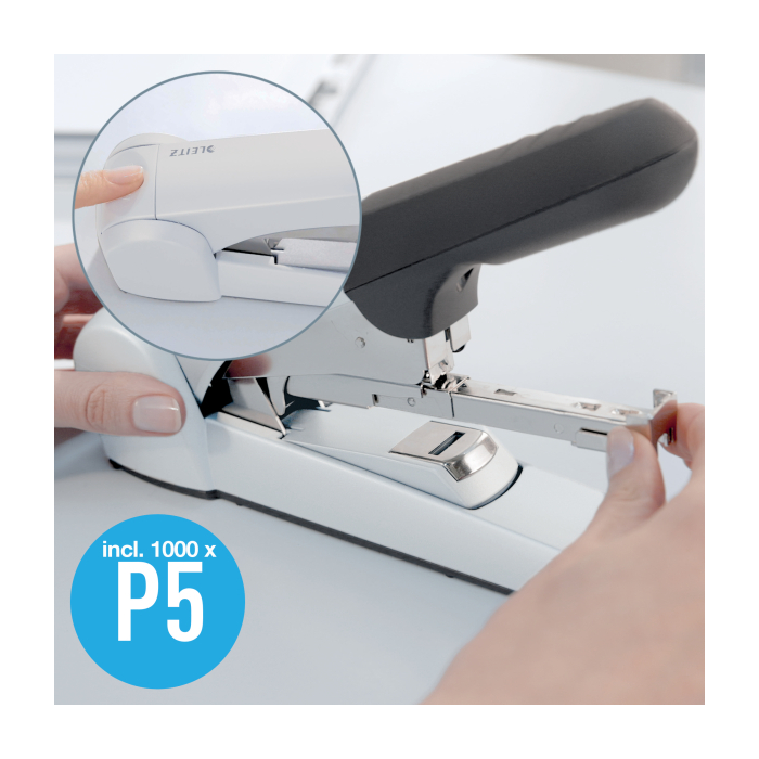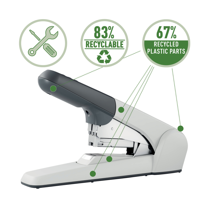 Ľahký model veľkokapacitnej zošívačky pre každodenné použitie v kancelárii. Jediným typom spiniek zošijete 2 až 60 listov papierov. Moderný design, elegantná kombinácia farieb. Zošívačka je vyrobená z plastu, mechanické diely sú kovové.