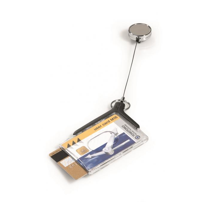 Kombinácia elegancie a bezpečnosti - elegantná, priehľadná akrylová visačka na dve plastové karty, použiteľná horizontálne alebo vertikálne. Dodávaná s chrómovaným výsuvným kotúčom a kovovým klipom na rubovej strane. Rozmery 85 x 54 mm. V balení 10 ks.