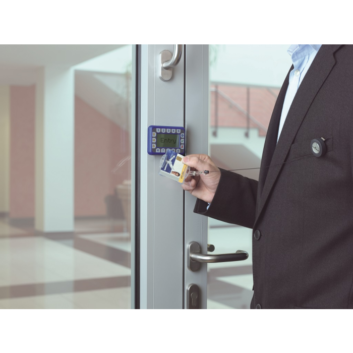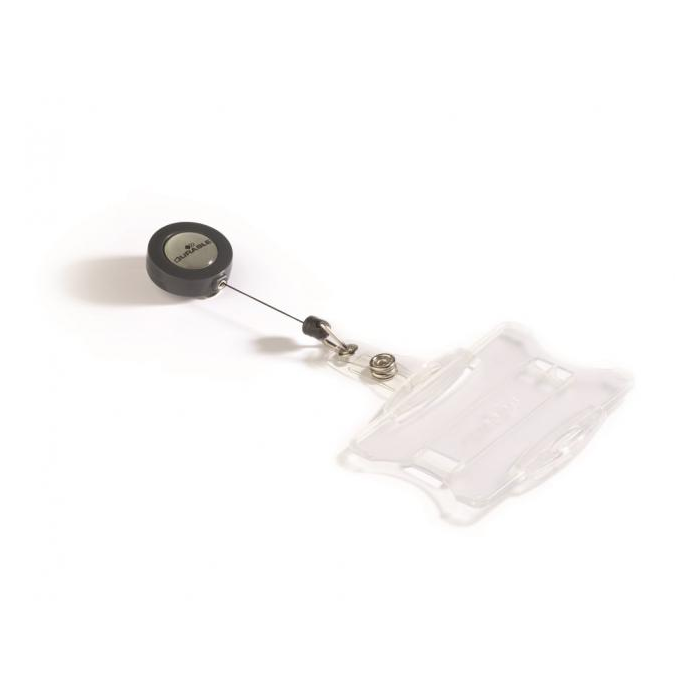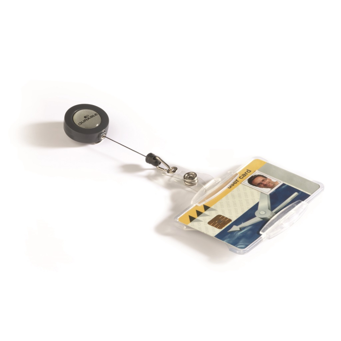 Plastová visačka na jednu plastovú identifikačnú kartu z priehľadného pružného plastu vysokej kvality, z prednej strany otvorená. Vhodná na ochranu magnetických a bezpečnostných kariet pred poškodením. Uchytenie klipu na kratšej alebo dlhšej strane poskytuje univerzalitu pri použití horizontálne alebo vertikálne označených kariet. Výsuvný kotúčik čiernej farby s kovovým klipom s možnosťou vysunutia do 80 cm. Balenie 10 ks.