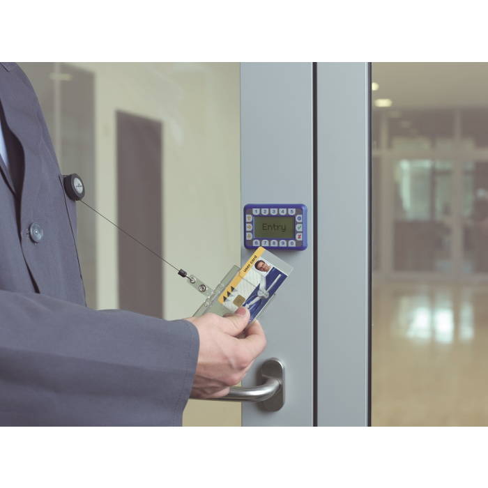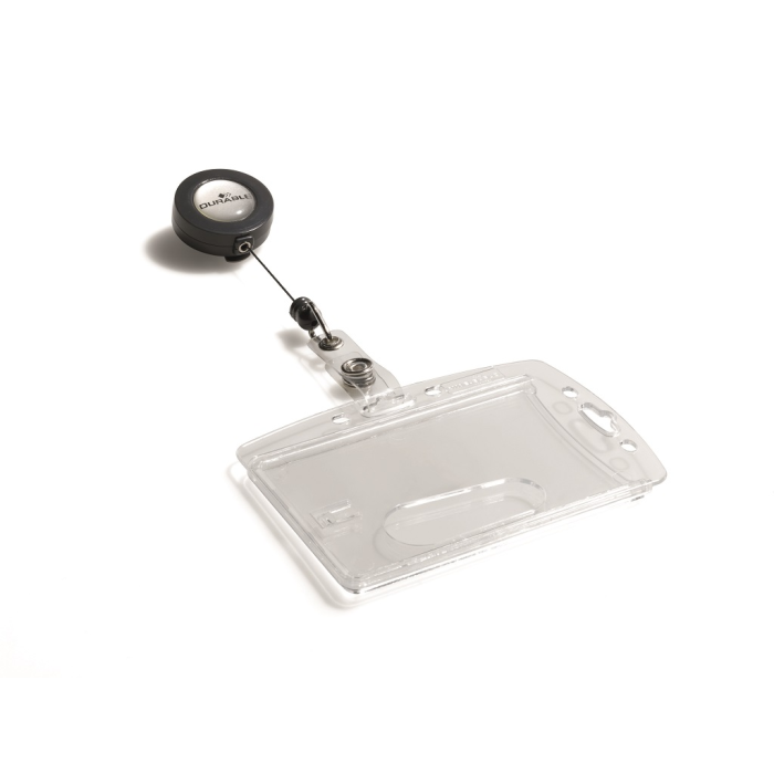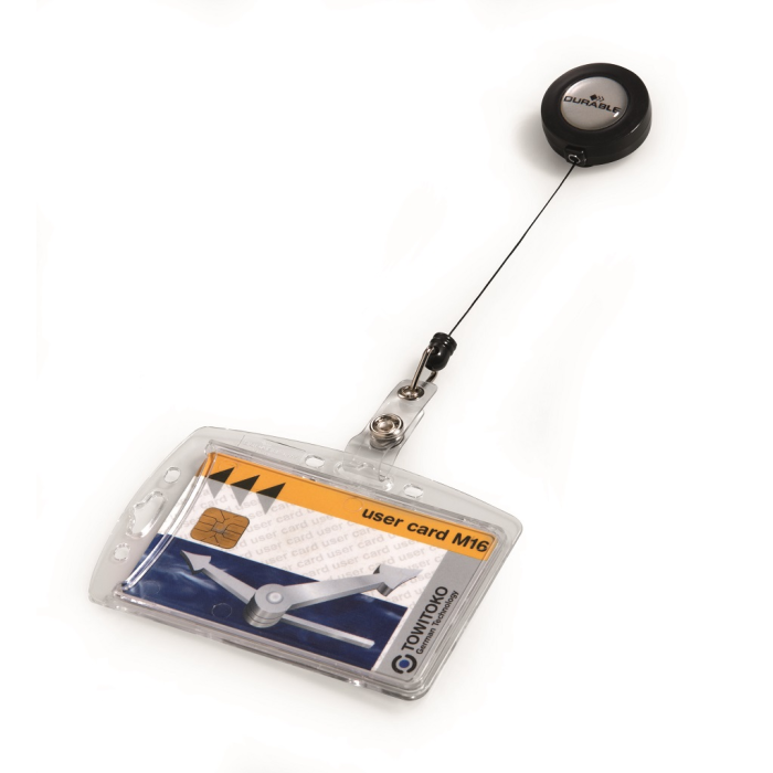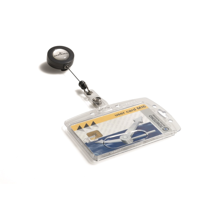 Visačka na jednu plastovú identifikačnú kartu z priehľadného plastu, ktorý chráni kartu pred poškodením. S otvorom na palec na rýchle a jednoduché vysunutie karty. Plastová visačka s výsuvným kotúčikom čiernej farby s kovovým klipom a možnosťou vysunutia do 80 cm. Balenie 10 ks.