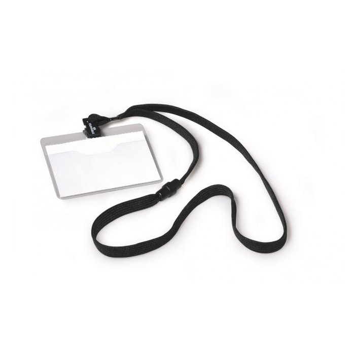 Visačka na krk s farebným bezpečnostným remienkom dĺžky 44 cm. Poistka na remienku sa uvoľní pri zachytení remienka alebo silnom potiahnutí. Materiál pevné priehľadné PVC, závesný remienok šírky 10 mm. Balenie 10 ks. Náhradné papieriky DU145602.