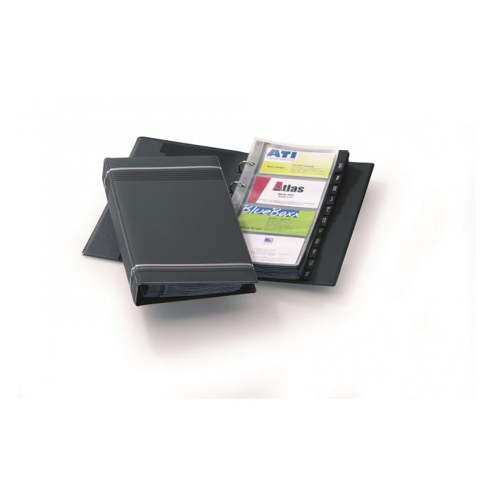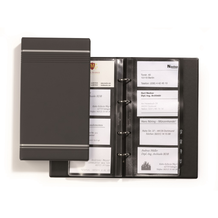 Exkluzívny zakladač na vizitky v úprave matné PVC so 4-krúžkovou mechanikou. 25 obalov z polypropylénu, 12 čiernych rozlišovačov A---Z. V dizajne Visifix s dekoratívnymi prúžkami. Rozmery 145×255 mm. Možnosť rozšírenia náhradnými obalmi obj. kód DU2387 19.( V balení 10 ks náhradných obalov.)