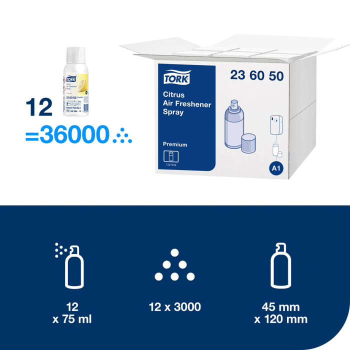 Náplň do elektronického osviežovača vzduchu TORK. Vôňu vo vašej toalete a umyvárni môžete dôkladne a efektívne kontrolovať. Sprej obsahuje vonné oleje a patentovanú zložku neutralizujúcu nepríjemné zápachy a zároveň poskytuje dlhotrvajúci pocit čerstvého vzduchu. Správna vôňa vyvinutá popredným európskym parfumérom.