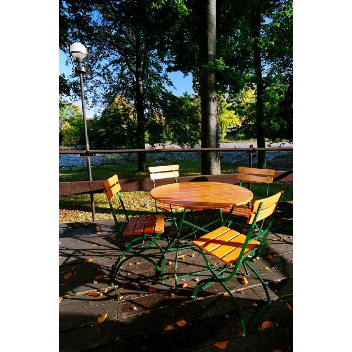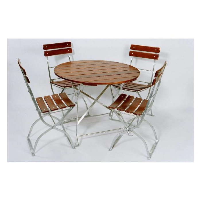 • stoličky a stôl sú skladacie a drevo je ku kovovému skeletu priskrutkované pozinkovanými vratovými skrutkami