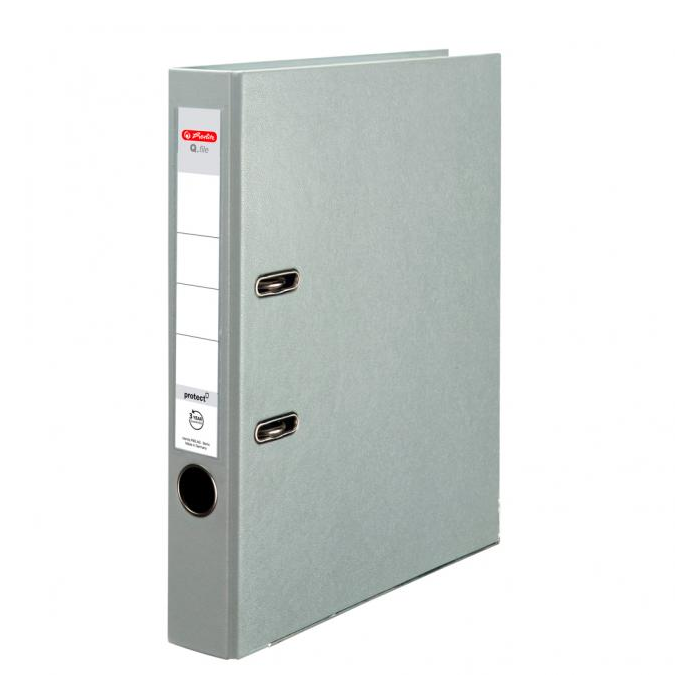 Pákový zakladač Q.file protect formátu A4. Šírka chrbta 5 cm. Materiál polypropylén, zásuvné vrecko, vnútorný biely podlep, lepenka 2mm, otvor na zadnej strane a radokrúžok pre lepšiu manipuláciu, kovová lišta. Farba sivá.